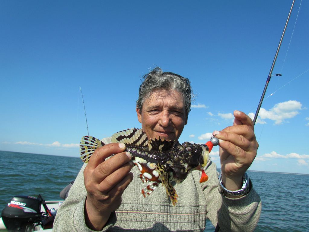 Всё блин, долетели. Народ тусуеться и ловит на пилькеры сплавом. Отходим на довольно пустое место. До ближайших лодок метров около двухсот. Находим пару интересных бугров с рыбой и заняв идеальную позицию для ловли в нашем понятии, становимся на якорь. В момент сброса якоря меня улыбнуло то, что мы наконец то припарковались. Берём смычки и за дело. К слову дело нас только и ждало. Сразу пощли поклёвки и рыбка начала отзываться почти на заброс. Но тут опять "но"! Вновь размер, не размер а недоразумение. Пять за борт, обну в ведро. А вот бралюкасы увидев это дело враз устремились к нашему параходу. Их размер совсем не смущал. Они хапужили и брали рыбу всех размеров.