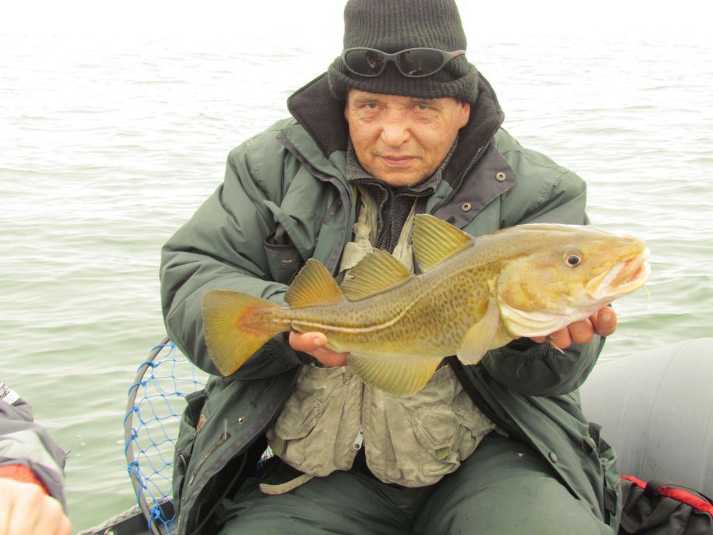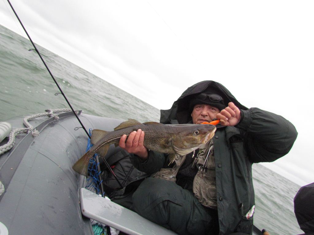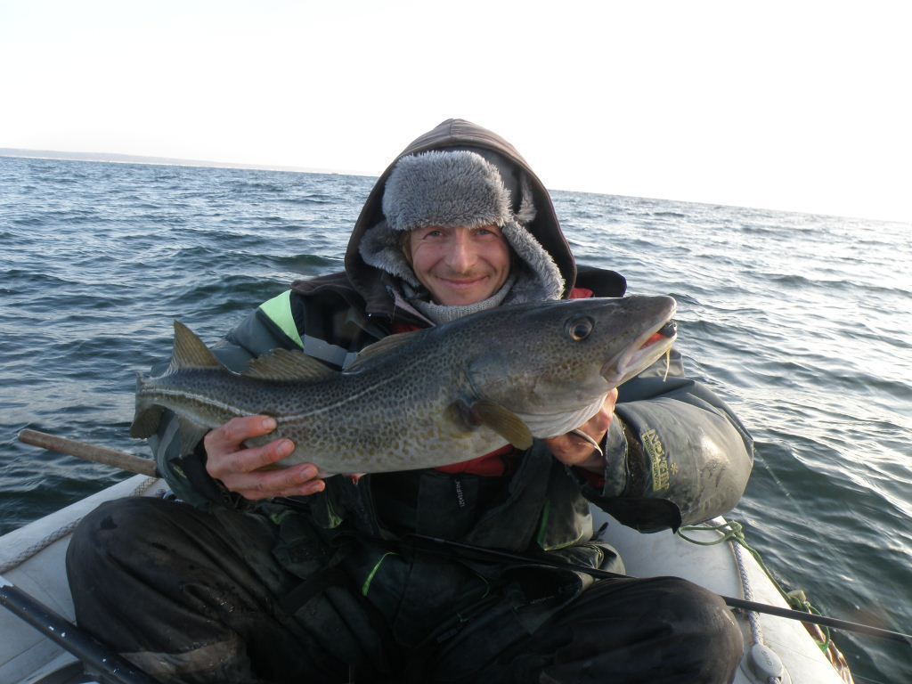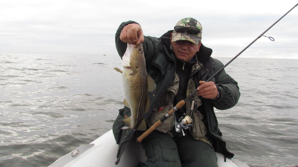 Точка просто забита рыбой, что отчотливо видно на экране кахалота. Начираем бросать и буквально сразу наши силиконки атакует, атакует Балтийский Тарпон, ну или сельдь а точнее салака, но сельдевого размера сантиметров по 22 - 25. Ужас сколько её под нами и на экране кахалота. Силиконки с джиг головками буквально не могут провалиться сквозь протный косяк рыбы, вершинки спинингов дёргаються а руки автоматически делают подсетки. Начался спиножоперный приём на борт забагреной салаки. До вечера её не сохранить в таком тепле и рыбу выбрасываем обратно. Если удаёться пробиться сквозь стаю и достигнуть дна, то почти без пустых проводок садиться тресочка, но и тут засада, она вся просто мизерная. На стаю фактически сельди, нападает меньшая, но более хищная тресочка. Вкалываються рыбки 200 - 300 гр. изредка на пол кило и слегка поболее. Вроде и клюёт, и весело, и не скучно, но ведь мы сюда не за этим приехали. Слеглка побаловавшись решаем идти с третьего на пятый к.м., да и лодки там тусуються. Мы собственно на лодки не ориентировались, просто приблезительно в том районе находиться серьёзный хрящик а если есть хрящик, то будет и рыба. Ну а лодки, так они тоже все с жопсами и забитыми точками.