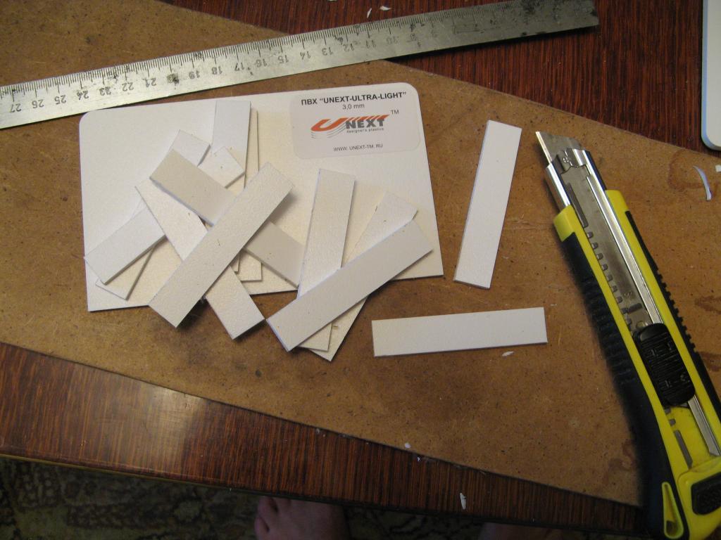 Итак, материал. Вспененный ПВХ листами. Начинаем с листа 5 мм, на котором размечаем бруски заготовок и внутренние полости: