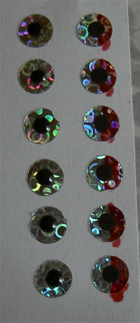 Выбиваем кружочки, наклеиваем на что-нибудь. Я использовал простую белую бумагу. На правой колонке кружочков я уже начал "гламурить" перманентным маркером. Пару слов о украшательствах. Можно закрасить весь кружок маркером, что бы изменить цвет подложки. К примеру есть только белая подложка, а хочется красный глаз. Думаю, что можно использовать текстовыделители (сам не пробовал). А можно воспользовавшись аэрографом и акриловыми красками создать целый шедевр с цветовыми переходами, разными цветами и прочими украшательствами, перламутрами, блестяшками и т.д. Кому на что хватит фантазии и места на глазке