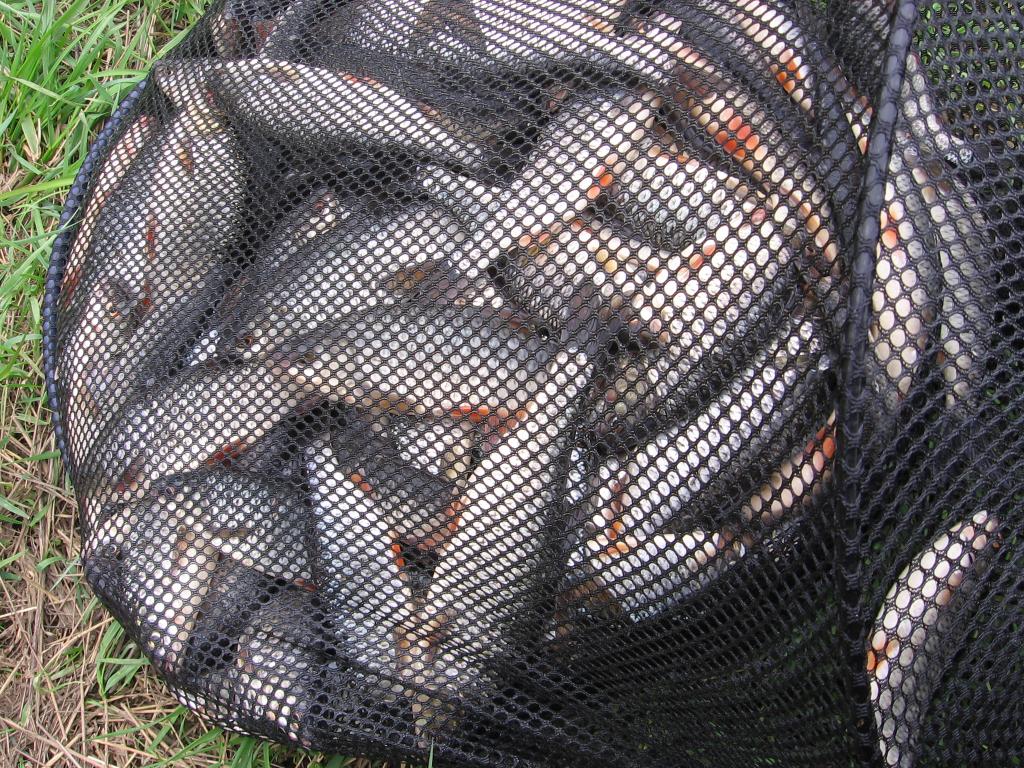В моём садке парилось несколько рыбок( не, ну ельцы красавы). У тёзки время от времени поклёвывало, и именно в тот момент, когда подходили разведчик, в в кол-ве пару человек. Взгляд, туда сюда. Ага, два садка в воде. Быстрая пробежка назад, и возвращается десант, в кол-ве 6-7-8-9 человек. Правда максимум на что их хватало, это минут 20-ть.