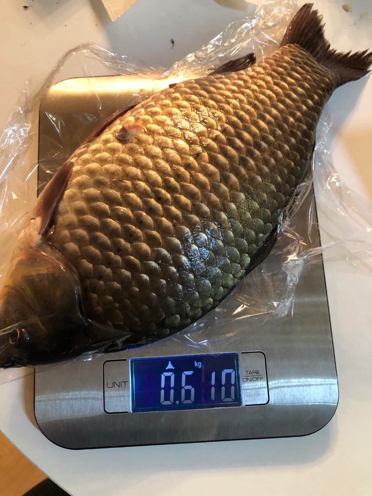 Итог рыбалки 9 рыб. Я взял 5 рыб. Заключительный карась наотрез отказывался лезть в подсак, яростно стартуя во все стороны. Вываживал долго. Это был самый большой экземпляр этого дня - 40см 1,6кг. Остальные тоже были закилошные и лишь один был докило.