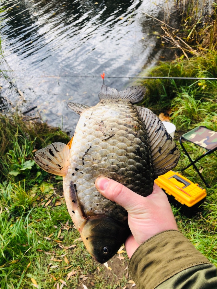 Объездив по утру кучу рыболовных магазинов, к обеду уже был готов и выехал на реку. Погода радовала. Приехал в 14, разложился, промерился, первый заброс - карась на крючке