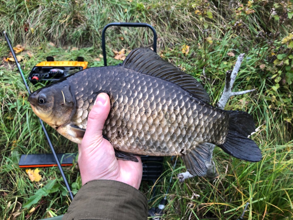 Карась клевал исправно, размер радовал. В этот раз забыл и садок и подсачек. Выводить приходилось под берег и брать рукой - всё на грани фола. Делал фото и сразу отпускал.