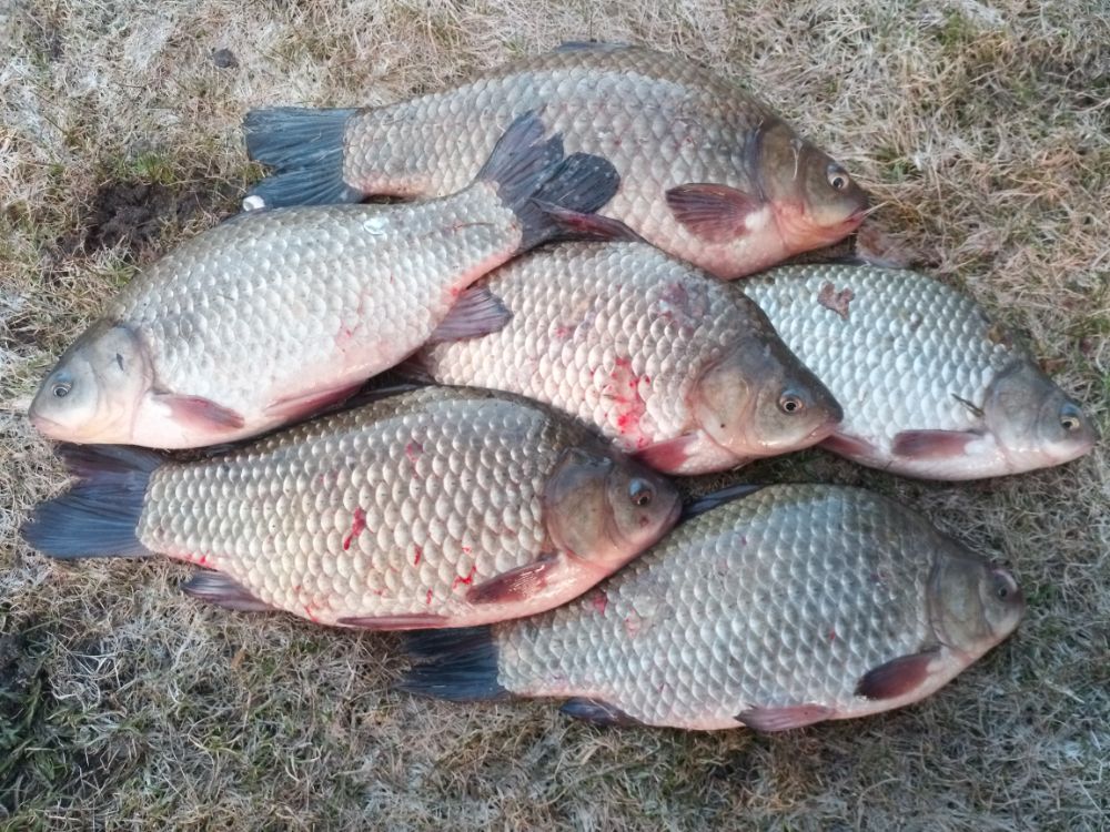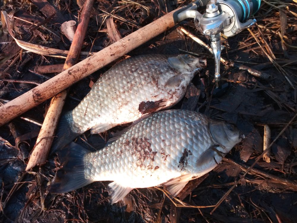 В 14:00 зазвонил будильник, пришло время сворачиваться. Ловил в общей сложности около часа, взял 4 карася. Очень хотелось пятого