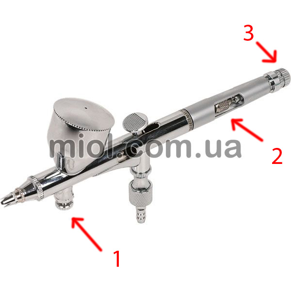 И еще вопрос ко всем. Обьясните назначение регуляторов (на картинке стрелки) и нужны-ли они вообще? Просто у Миола есть модель по-проще, но сразу с соплом в 0.3. Думаю его брать. И вообще, смогу-ли я грунтовать с таким соплом?