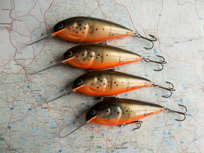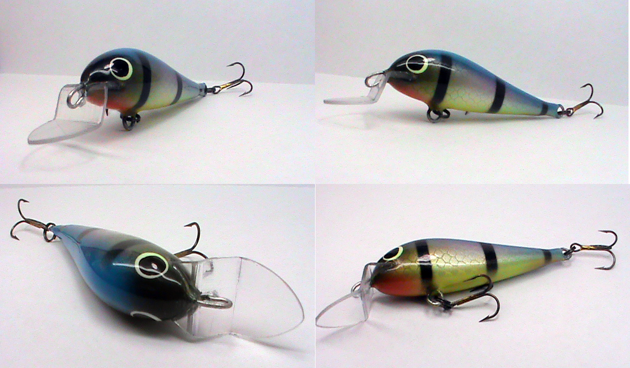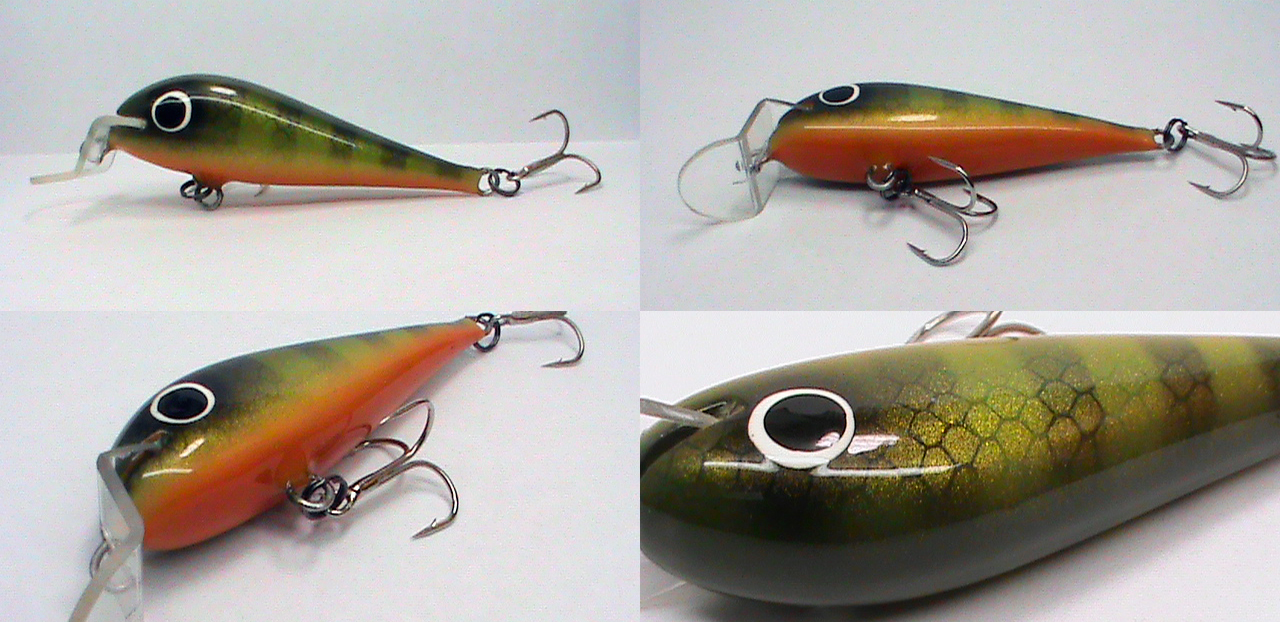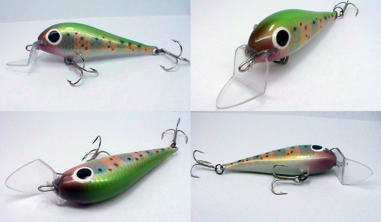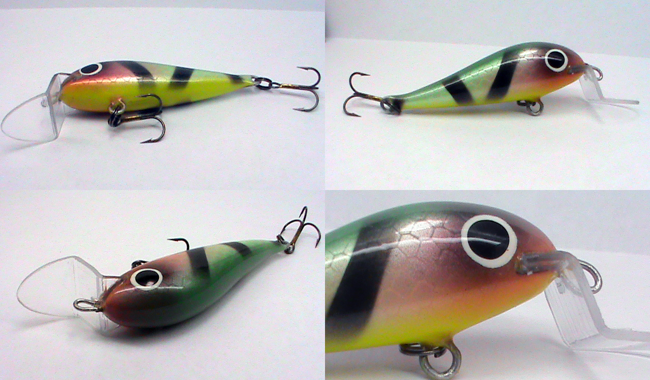 65 мм игра высоко частотная со средней амплитудой. 65 мм игра средне частотная со средней амплитудой. 70 мм игра средне частотная с большой амплитудой, единственный делающий небольшие уходы в сторону, вообще расцветка не удалась но оставил так. Был еще четвертый но на последнем лаковом покрытии предыдущие слои поднялись как лягушачья кожа, пришлось перекрашивать. Воблеры с такой лопаткой мне очень нравятся, и игра и как делать, но вот жаль ловить на них не всегда получается.