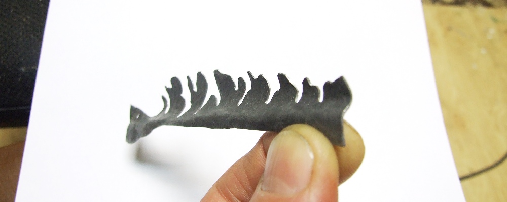 зачем пилить? вырезаю две половинки по одному шаблону (по гнутому), обтачиваю и далее временно склеиваю между собой двусторонним скотчем. Обтачиваю по 2-му шаблону (по ровному). После зачистки канц. ножом половиним и получаем верхнюю и нижнюю половинки (по отношению к самой рыбке) Теперь делай с ними что хочешь: арматура, грузы, отверстия, бисер, ... хоть камеру заброса. Только судя по фото оригинала среднюю петлю я старался утопить только в нижнюю половину.