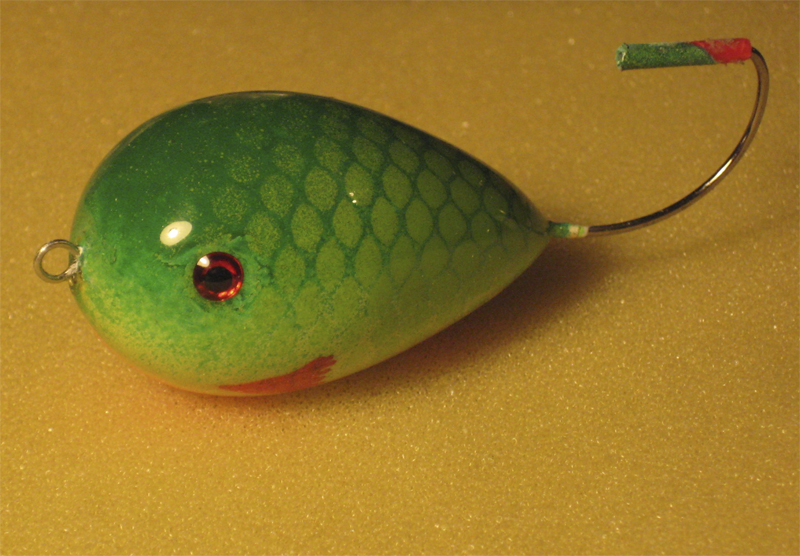 Продолжим тему глиссеров. Как и писал выше сделал яйцо из бальсы. Получилось гораздо лучше, чем из липы. Очень верткое . Длина 55 мм, вес-13 гр. из них 5 гр - свинец. Крючок 5/0, гнул после отжига в нужных местах турбозажигалкой. Старался опустить центр тяжести вниз. Пропитка - эпоксидка. Окраска - балонная. Финиш - яхтный лак.