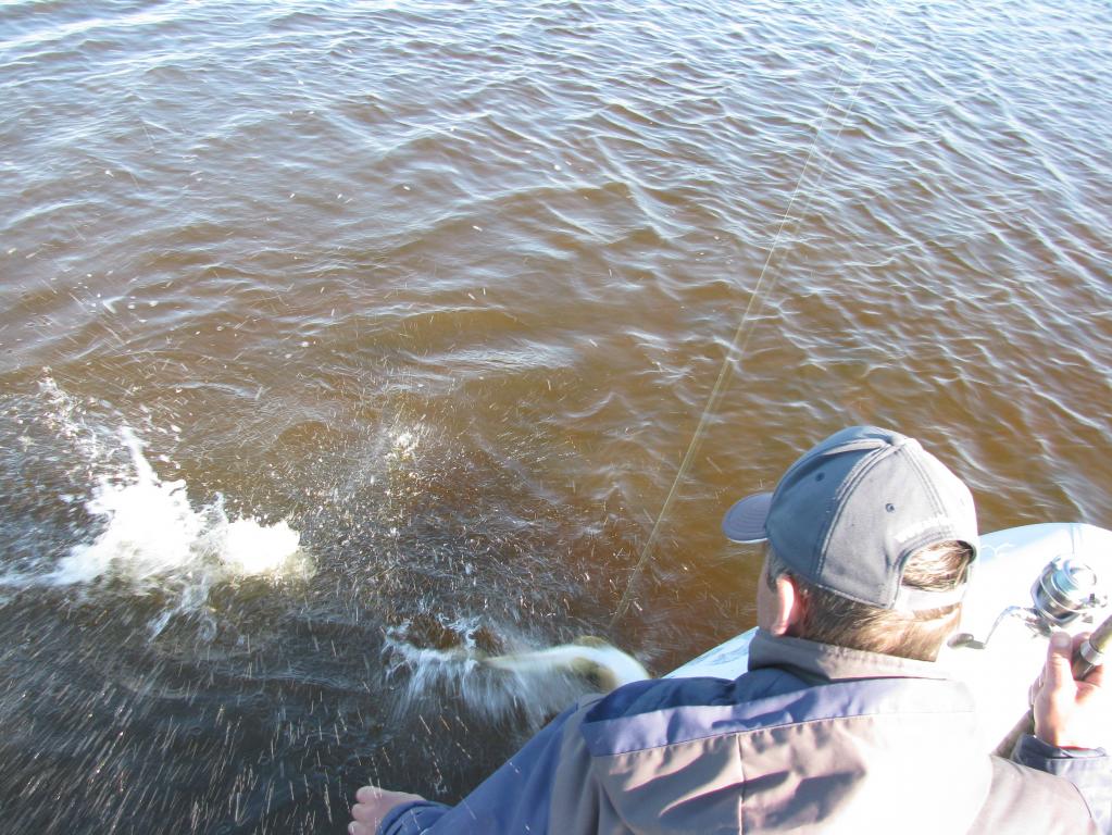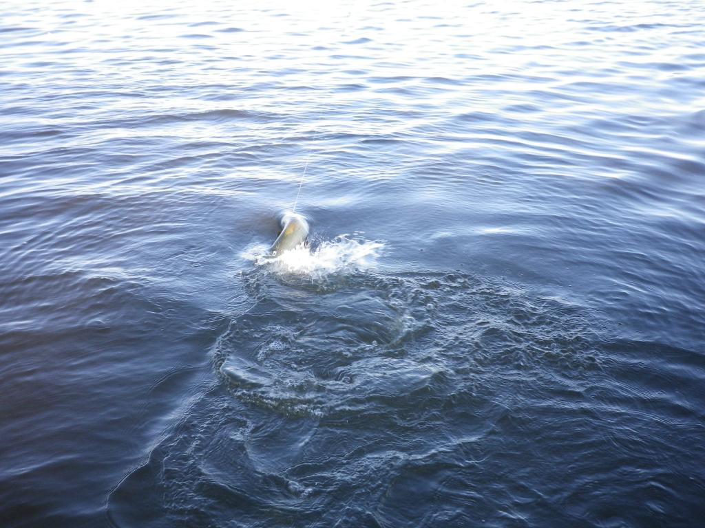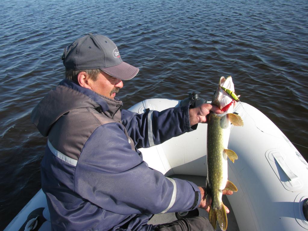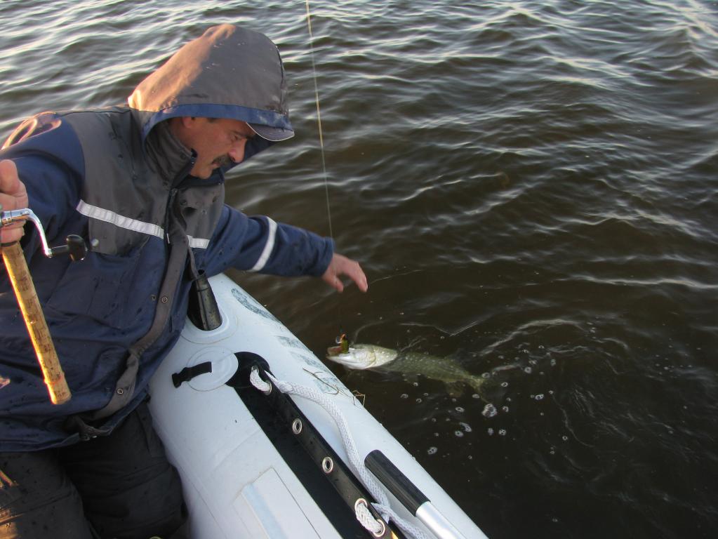 Вчера удалось выкроить день и выбраться на залив. Освободился от ежеднеыных утренних дел около 8-ми часов, поэтому на зорьку не попал. Приехал к "орнитлолгам" уже около 10-ти, накачался, перетащил весь нехитрый скарб к воде и пошел искать счастья. Воды очень мало. Ветер восточный, практически штиль. Рыба толи уже закрыла рот, то-ли его и не открывала нормально. Через час первый выход, потом одна полторашка, дальше нашел участок, где что-то происходило. Там на джерки вымучил пару затрешек и несколько поменьше. Были и мультики, правда близко к лодке щука не очень подходила - все происходило на удалении. Около 3-х часов ветер сменился на 180 градусов и рыб закрыл рот наглухо. Единственные, кто проявлял интрес к блесне были шнурки до килограмма, которых отпустил штук 10. В общем получилась нормальная, но трудовая рыбалка.