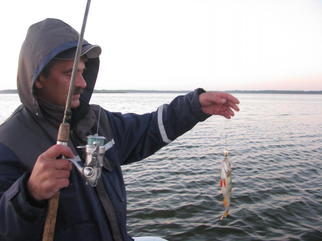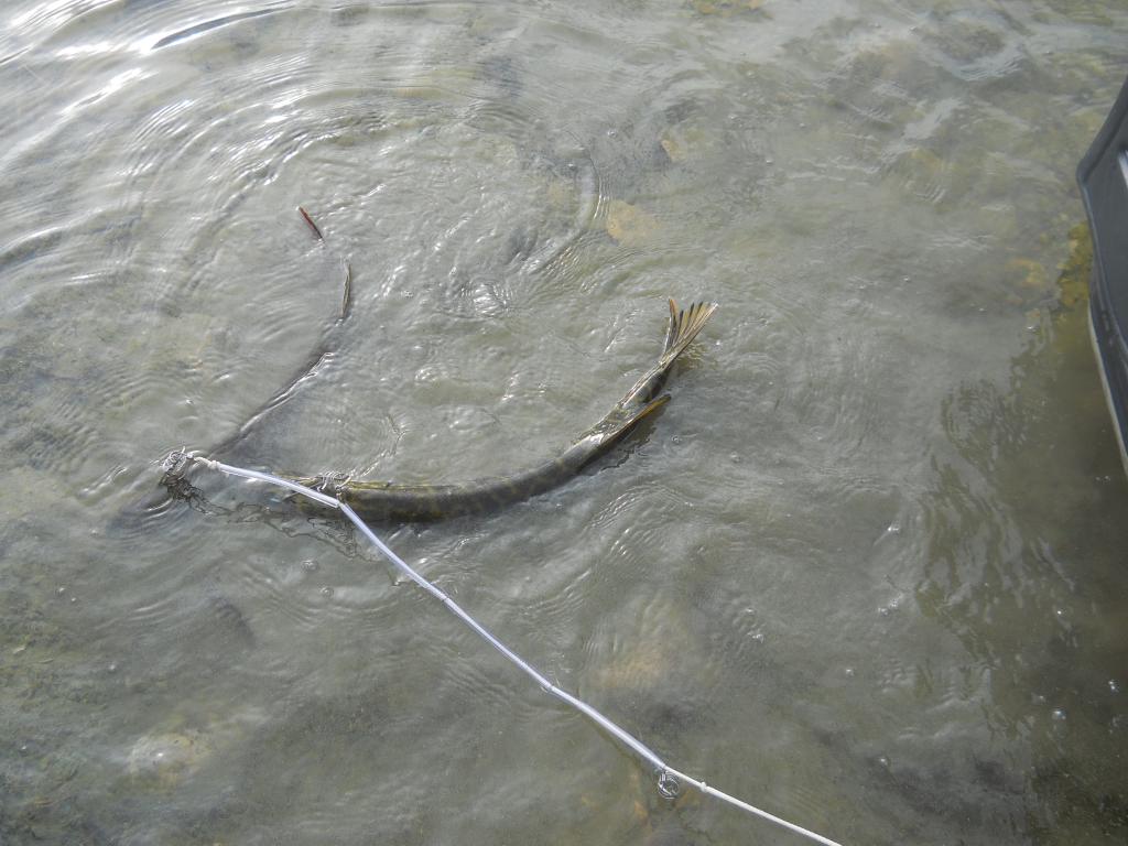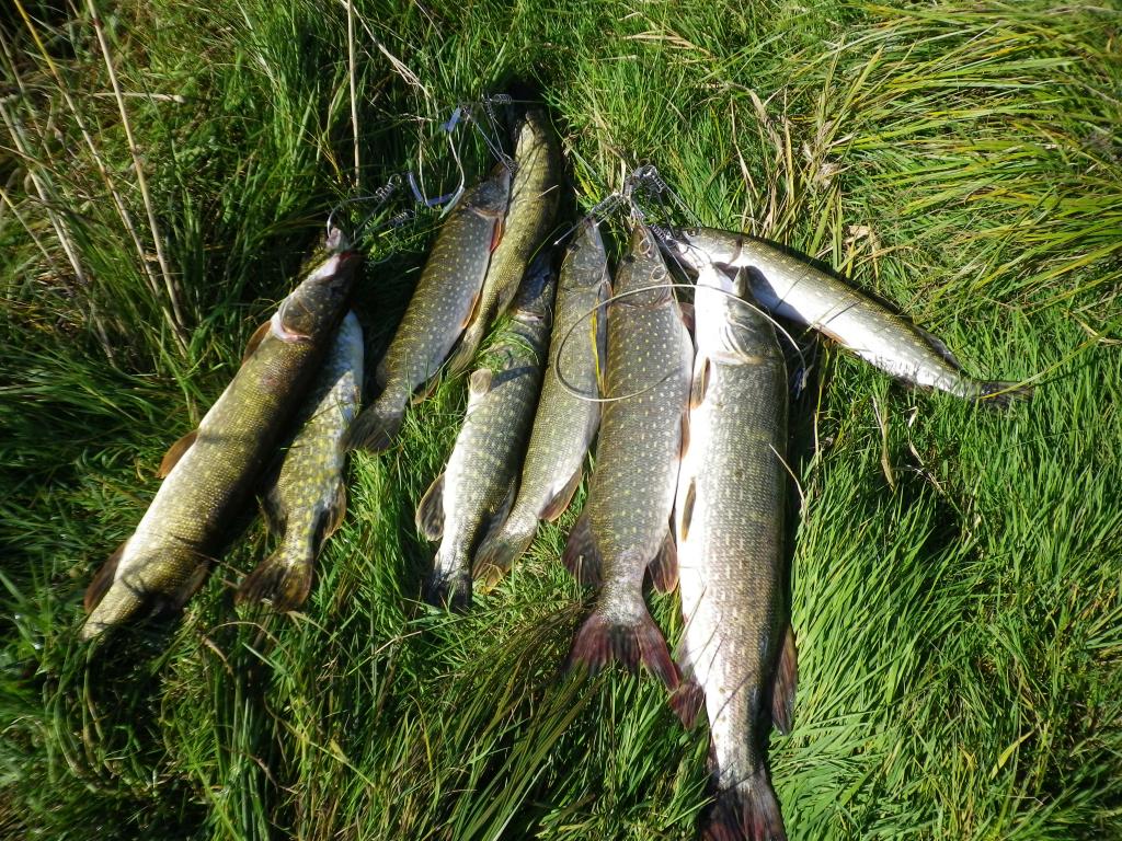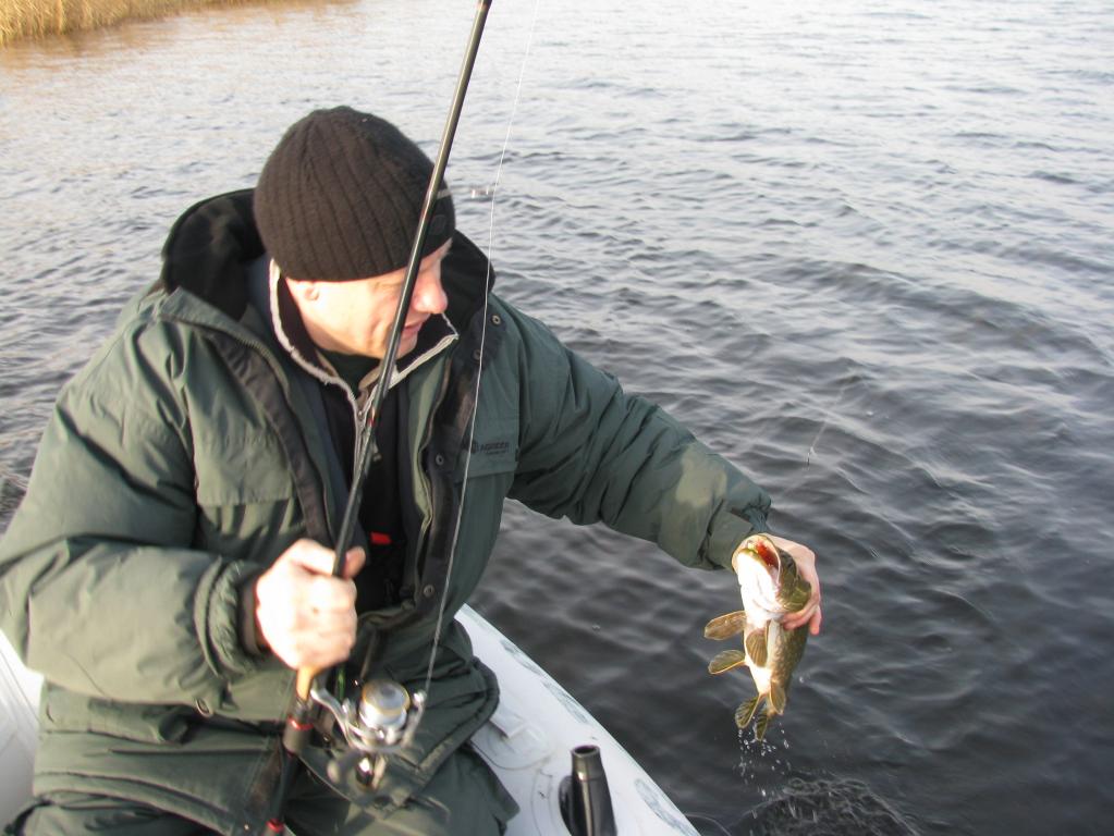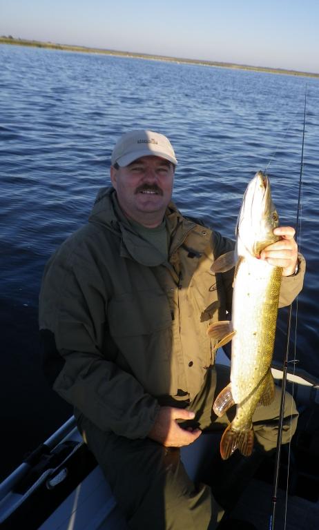Вчера удалось выкроить день и выбраться на залив. Освободился от ежеднеыных утренних дел около 8-ми часов, поэтому на зорьку не попал. Приехал к "орнитлолгам" уже около 10-ти, накачался, перетащил весь нехитрый скарб к воде и пошел искать счастья. Воды очень мало. Ветер восточный, практически штиль. Рыба толи уже закрыла рот, то-ли его и не открывала нормально. Через час первый выход, потом одна полторашка, дальше нашел участок, где что-то происходило. Там на джерки вымучил пару затрешек и несколько поменьше. Были и мультики, правда близко к лодке щука не очень подходила - все происходило на удалении. Около 3-х часов ветер сменился на 180 градусов и рыб закрыл рот наглухо. Единственные, кто проявлял интрес к блесне были шнурки до килограмма, которых отпустил штук 10. В общем получилась нормальная, но трудовая рыбалка.