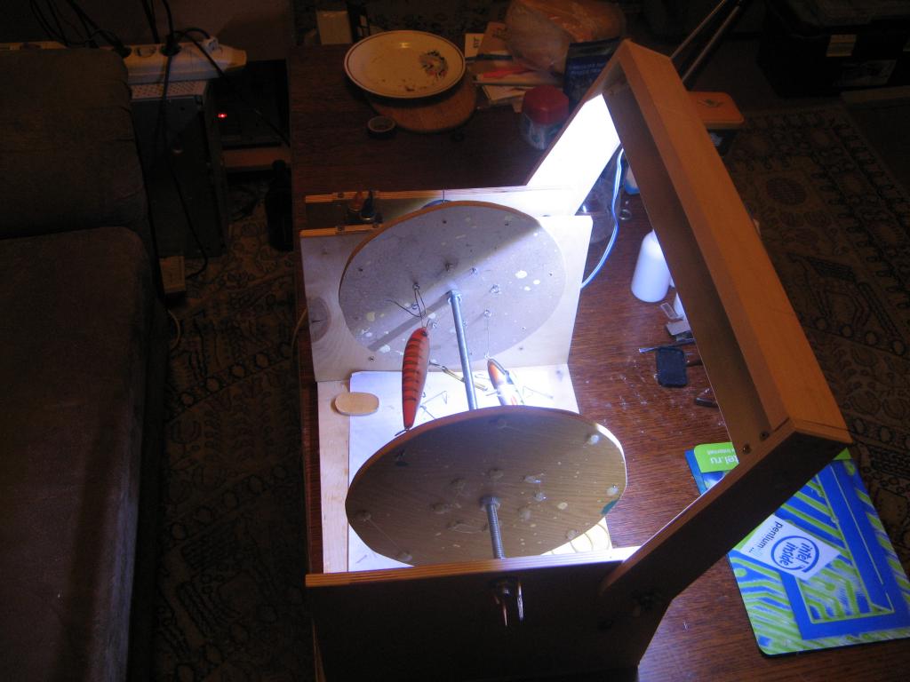 Для начала, по совету Михаила (IKEL) повесил лист бумаги. Точнее, полоску. Чуть отслонив ее от светодиодов, миллиметрах в 4-5 от них.vdv писал(а):когда поверхность становится глянцевой от финиша, полоса отраженного света на воблере превращается в два десятка ярчайших точек.