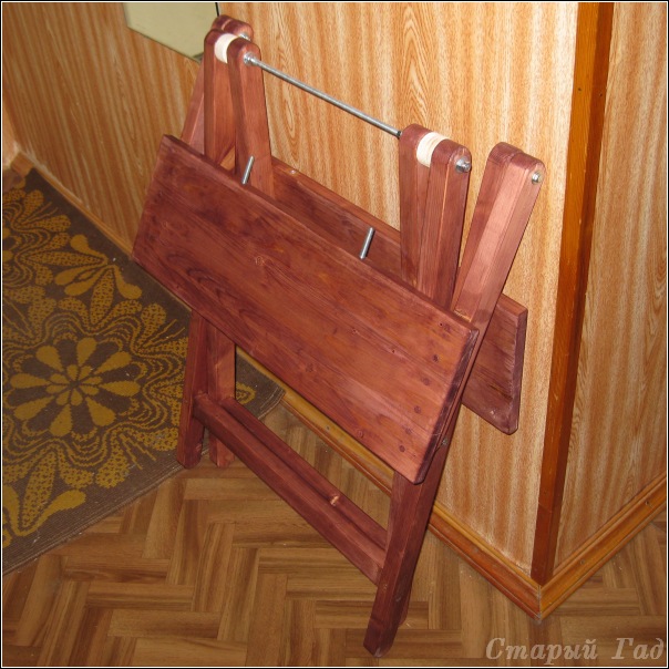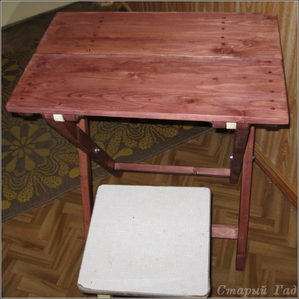 Не инструмент и не приспособление - так, сильно комковатый блин. Первый опыт в изготовлении полностью деревянной мебели. Собрание разнообразных косяков: конструкционных, рассеяно-склеротических (поперечины на половинку столешницы прикрепил по ... вспомогательным линиям, которые проводил для придания столешницы в сборе прямоугольной формы) и просто огрехов изготовления. Про то, что водными ЛКМ (морилки, лаки) делать "финиш" изделиям из сосны не то чтобы нельзя, но начинающим просто не рекомендуется (бытовой хренью из сетевого гипермаркета тут не обойдешься, как оказалось) - често говоря даже и не знал. Ну и выбор цвета морилки - попса голимая, тьфу на мою седую голову