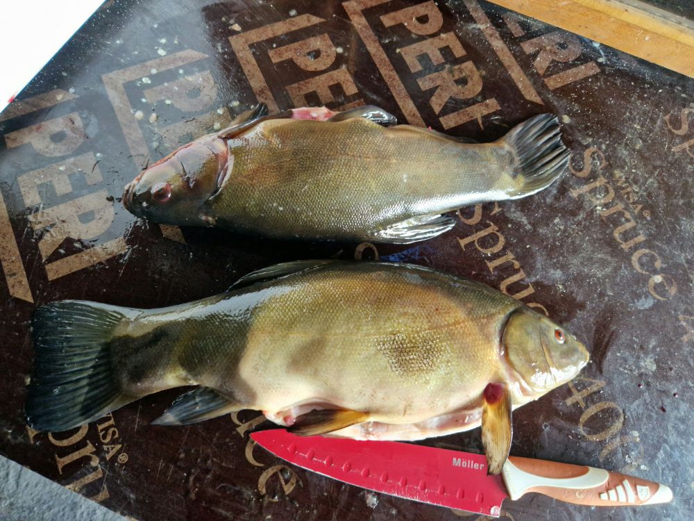 Прикупил еще к ним парочку карпиков (общим весом 1,3 кг), час назад они резво плавали в магазинном аквариуме. Как я их чистил и потрошил показывать не стану – сей процесс никак не способствует повышению аппетита.