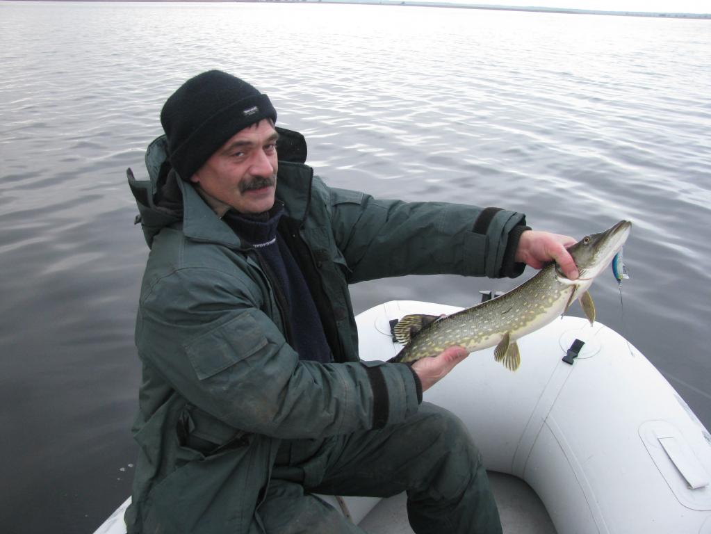 Когда подъехали к площадке-там уже тусовалось около десятка транспортных средств. С шутками и прибаутками вышли на воду,я в одной лодке с Олегом. Сразу на выходе, только закинул "на дорожку"... произошел удар ,но счучка сошла. До точки дошли быстро. Тут же начались пробежки шуки за приманкой ,которую она провожала до самой лодки. Где-то за пол-часа подобрал приманку, и проводку. Дело пошло на лад. Заметил,что как только сбиваешься с ритма проводки -щука только преследует приманку ,но не атакует ее. Поймал в течении полутора часов 7-8 шт. Щука красивая ,но больше трешки не попадалось. У Олега тем временем было совсем грустно. Спиннинг "лапшевый" и ему было трудно подобрать нужную проводку.