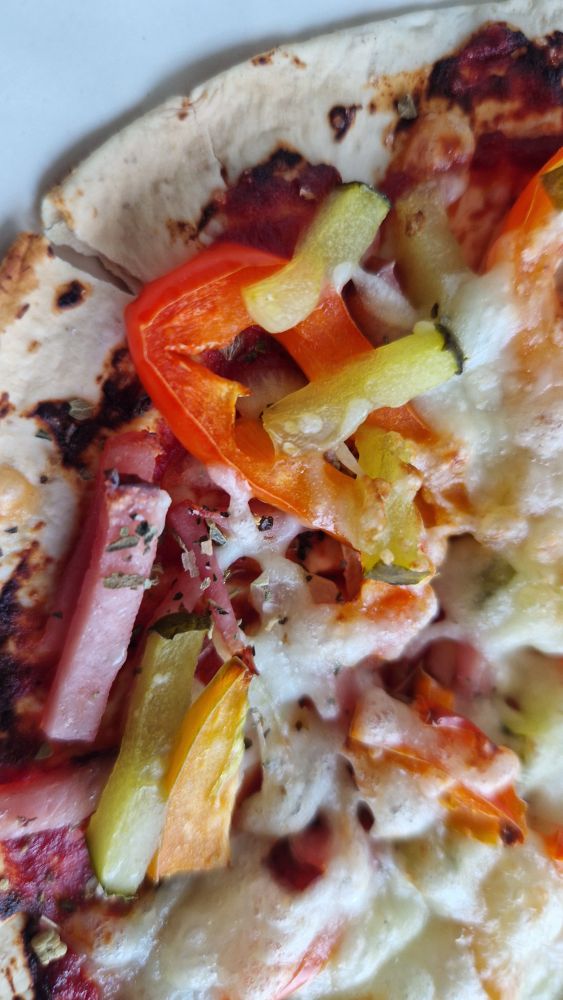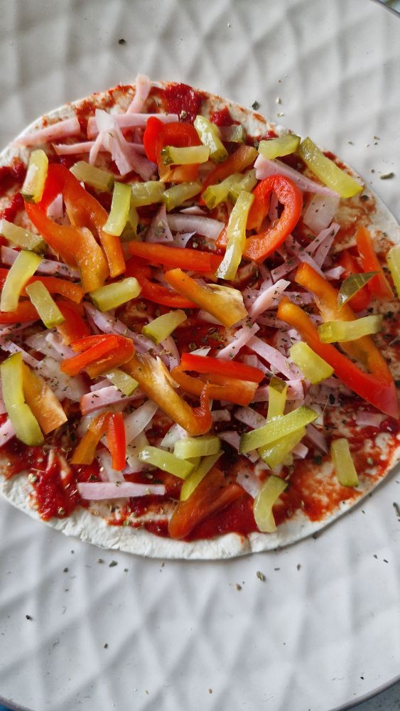 Затем, что кому нравится, удобно порезать мелкой соломкой и накидать ровномерно сверху. Маринованный огурец, ветчину, мясо колбасу, перец болгарский, лук репчатый и еще че нравится. Все присыпать тертым сыром и загрузить аккуратно в аэрофритюр, можно в сковородку (контролировать сложнее процец готовки). Время готовки 6 минут при 190 градусов и можно наслаждаться вкусом.