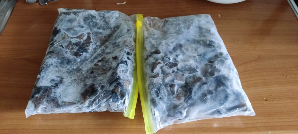 Проводя ревизию морозилки нашёл замороженные прошлогодние грибы. В преддверии нового грибного сезона, судя по погоде, весьма продуктивного, нужно старые запасы уничтожать. А грибы к заморозке готовлю так. Может это и не правильно, поправьте. Но мне нравится. После грибного похода и чистки грибного результата хочется уже побыстрее улечься на диван и расслабиться.Поэтому подготовка занимает минимум энергозатрат. Грибы почищенные, порезанные и промытые складываются в кастрюлю, можно с горкой, пол стакана воды, чтобы не прилипли. Немного соли и на огонь. Варим минут пять. Остывает и в ёмкость. Любую. Я люблю такие пакеты.