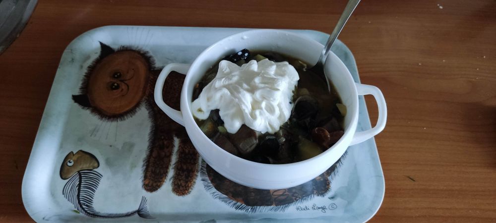 Готовый бульон , фильтруем , сливал в другую кастрюлю. И снова ставим на костёр, добавляя картошку и морковку . Ждём готовности и потом специи и всякие ништяки . Ну а потом рюмка водки холодной и приятного аппетита.