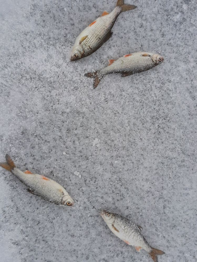 Были моменты когда брала и в 30см от дна, всё на чуйку и интуицию. Хоть ещё по тёмному нахерачили кучу лунок, прикормили и как сели рядом на первые так и сидели. Пока один ловил со дна второй пробивал выше и так по очереди, ловили с прикормкой, пару шаров в час, с 7 до 14 использовали 2 кило. Цвет мормышки особо роли не играл, хотя показалось что жёлтая с черными точками была предпочтительней.