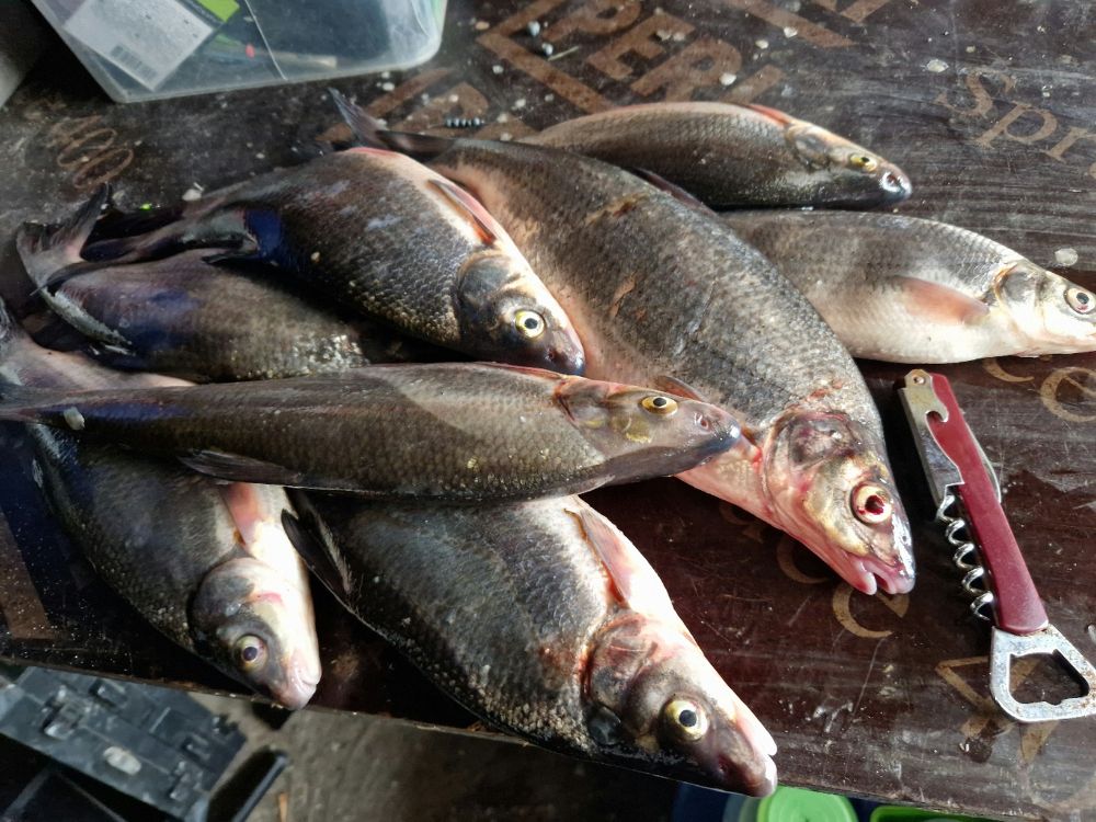 Утром клевало, меня вштырило прострелом в спину, когда встал после перевязанного крючка, с 6-9 клевало неплохо, потом без прикормки не хотела на отрез. Я постарался не мешать напарнику со своей спиной и даже натаскал кил 15 хорошей плотвы и вимбы, закончили в 12 . Результат под 50кг, взяли с десяток штук родне на жареху. Сейчас отлёживаюсь намазанный и залитый обезбаливающими, завтра на работу.