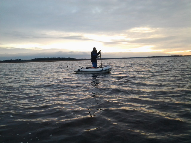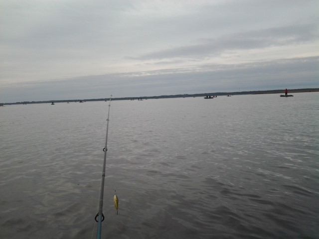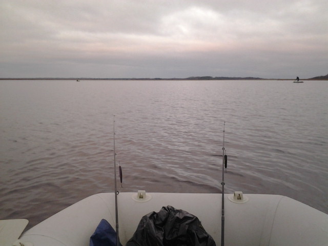15 -го, в понедельник побывал на заливе. Воды много. Вышел с площадки Таебла. ветер штормовой, холодно, вода-мутняк-что еще нужно рыбаку для полного счастья? Выскочил, по дурости, на средину - понесло с 5-кг якорем. Даже не пробовал выгрести против ветра. По рыбе грустно, даже очень.....