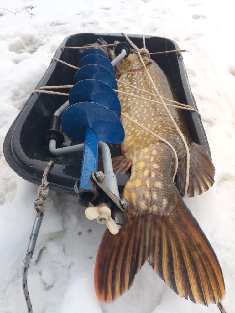 Думаю это длилось минут 20. Ломая перегородки между лунками бур погнул малехо. Но тут было не до жиру. Лед на удивление толстый. Около 50см. Пришлось разоблачится до голого торса, чтобы леску передать с одной на четыре. И вот голова въехала вертикально. Багориком под жабру и.........ю