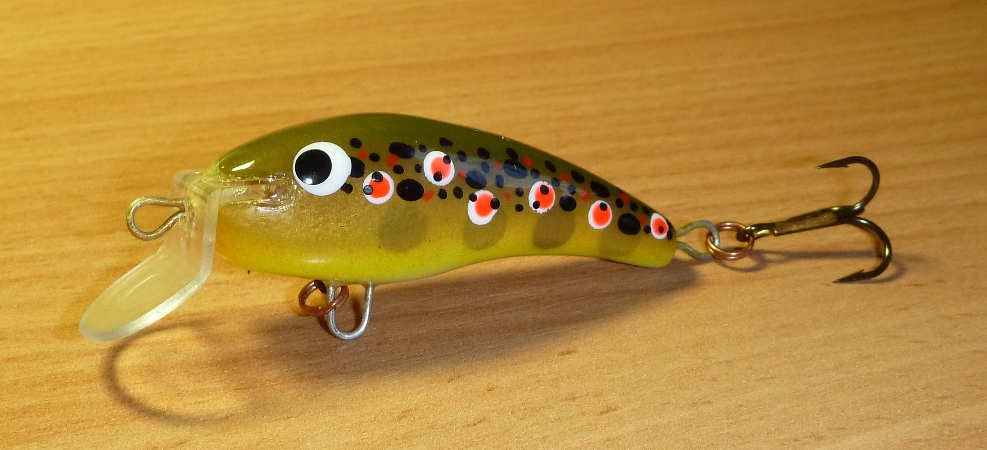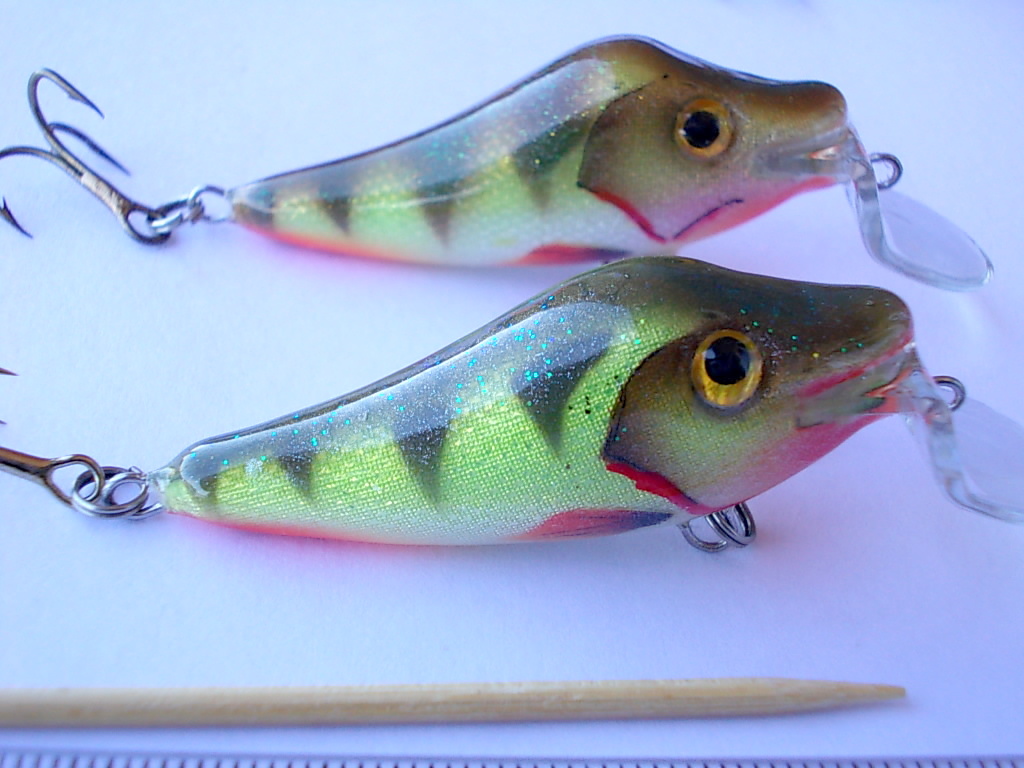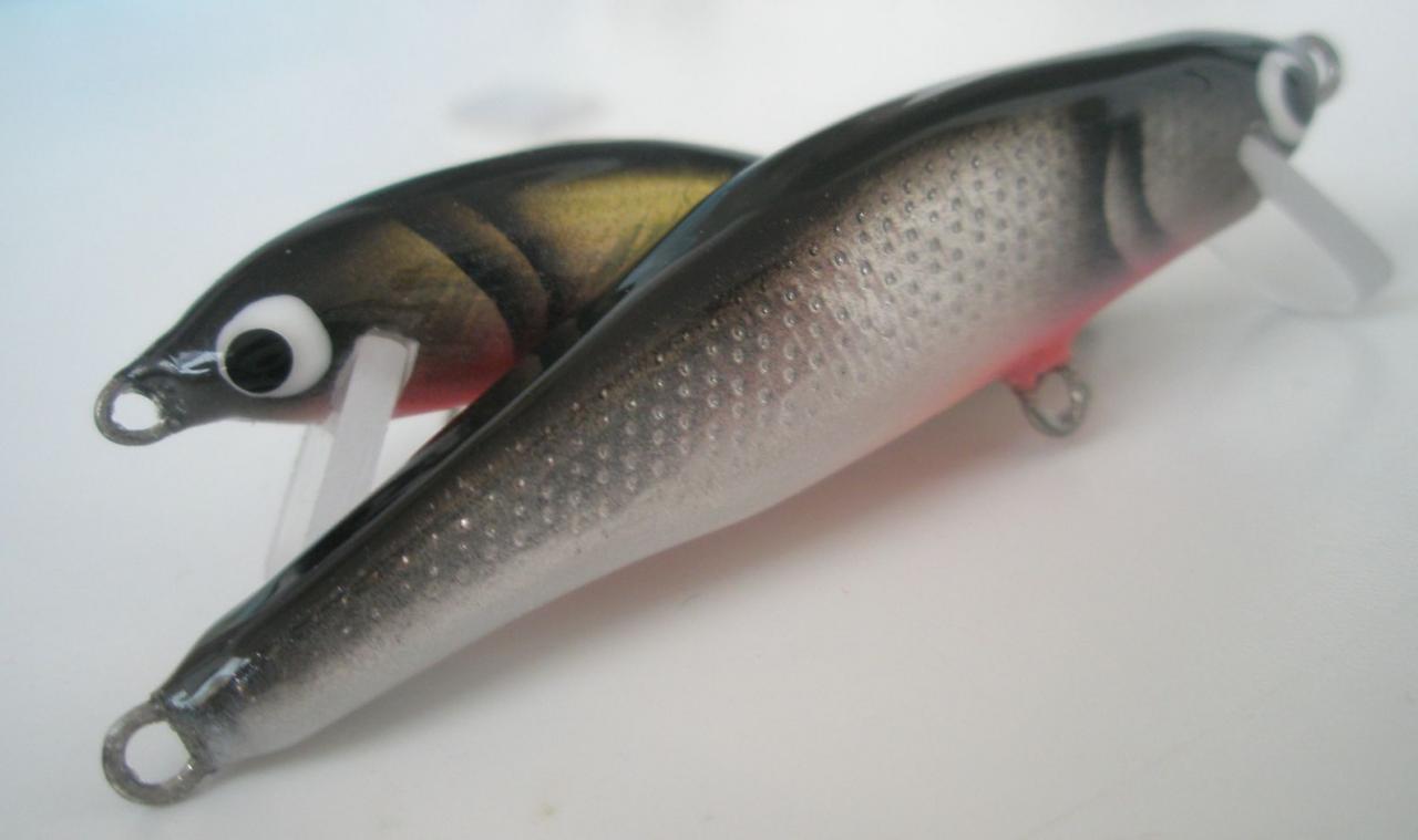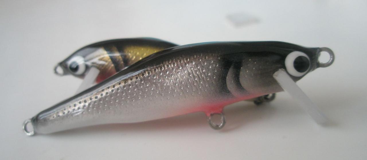 Интересная фотография, у меня такой нет. Да я не только их делаю, (вообще 15 наименований в десяти цветах) - цвета простенькие, без плавников и чешуек- (не вижу в этом смысл, на активно играющем воблере). И ещё У меня вся система: краски и лак и пропитка--- все нитро( черные и красные цвета съедаются в полу тонах и тонких линиях . Поэтому все достаточно контрастно и четко, и просто.