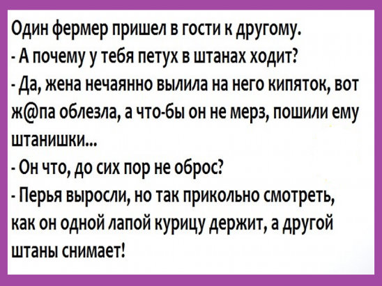 - Отнесу домой жене, она меня накормит, самогонки с погребу достанет, а потом у нас будет секс. А ты со своей что сделаешь?