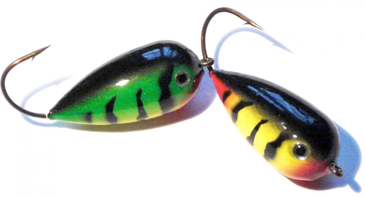 Вот он первенец - первый тестовый лайтовый воблер - окушек, рядом со старшим полосатым деревянным братом.