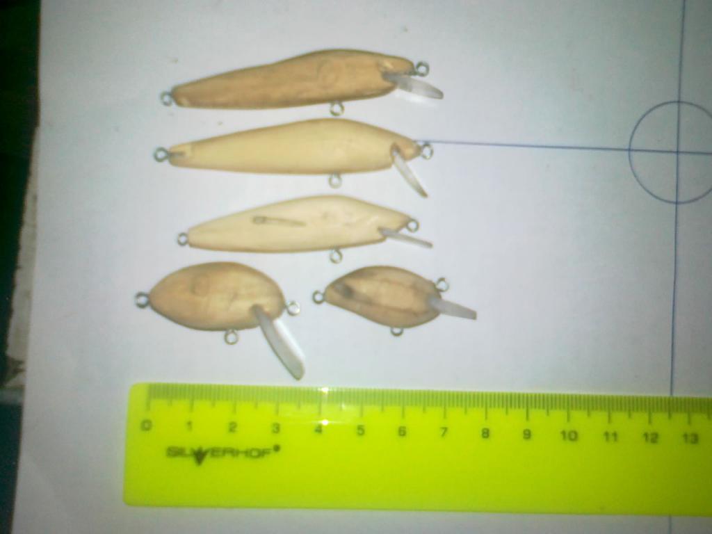 Всем привет!Вот недавно подсказали этот форум.Неделю уже сам изготавливаю(ну это громко сказано...учусь изготавливать)воблеры.Первым стал kosadaka ion 55,потом alex ritmo(этот сложнее).Так вот - смотрю даже на небольших воблерках применяют огрузку,путём линейки,напильника(вроде весов получилось)и набора грузиков вычислил приблизительную массу воблеров - не более 1.2 г.Ещё конечно добавятся и заводные кольца,и тройники,но всё равно легче оригинала(или достаточно?).Хочется достичь состояния "медленно всплывающий).Поэтому на каждом воблере пометил примерную массу груза который(как мне думается)стоит применить.От всей массы воблера это примерно 30%(не знаю почему именно такая цифра).И где размещать?На минохах в передней части?А в ритмиках?И о покраске: мне бы пока что-нибудь попроще.В планах погрунтовать(будет коричневого цвета)потом гуашью покрасить,зачистить немного и потом уже лаком.Или после грунтовки лаком для ногтей или рыболовным лаком можно покрасить?Вопрос с петлями - пока не знаю как надо распиливать\раскалывать воблер чтобы делать каркас с петлями,поэтому каждую петлю вставлял отдельно.Надеюсь,держаться будет.И чем петли и лопасть приклеивать - думается мне что эпоксидной смолой?Вроде бы ничего не забыл перечислить.Всем спасибо.