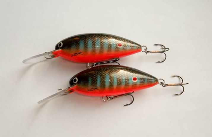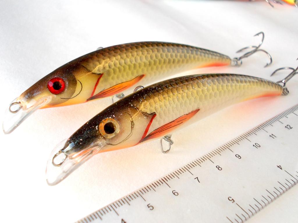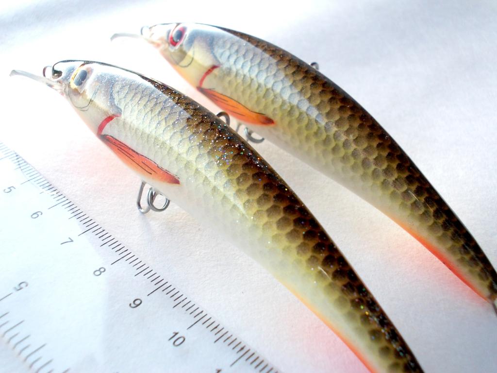 ЗЫ: Воблеры в профиль абсолютно одинаковы - склеивал заготовки при обработке, но из-за особенностей окраски и падения света верхний кажется "худее". А текстолита (плата от сдохлой мыши) на второй не хватило