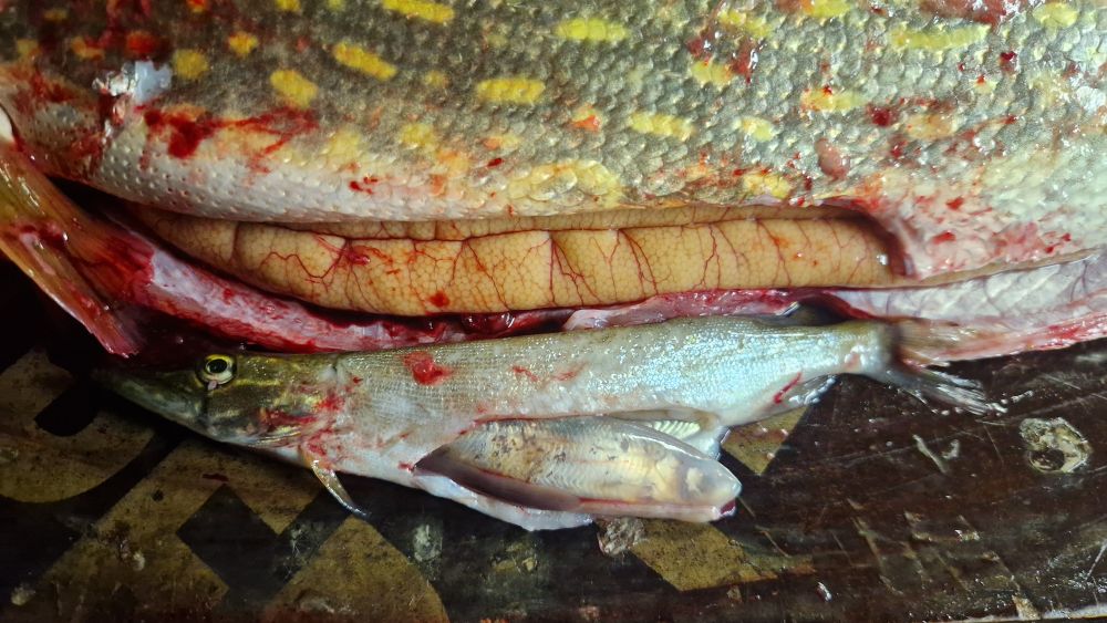 Но удалось поменьше щук уговорить, самая большая 4кг, самая мелкая 2кг. У трешки в желудке щурёнок, а у него в желудке уклейка , причем хвост зубами щучки прижат.