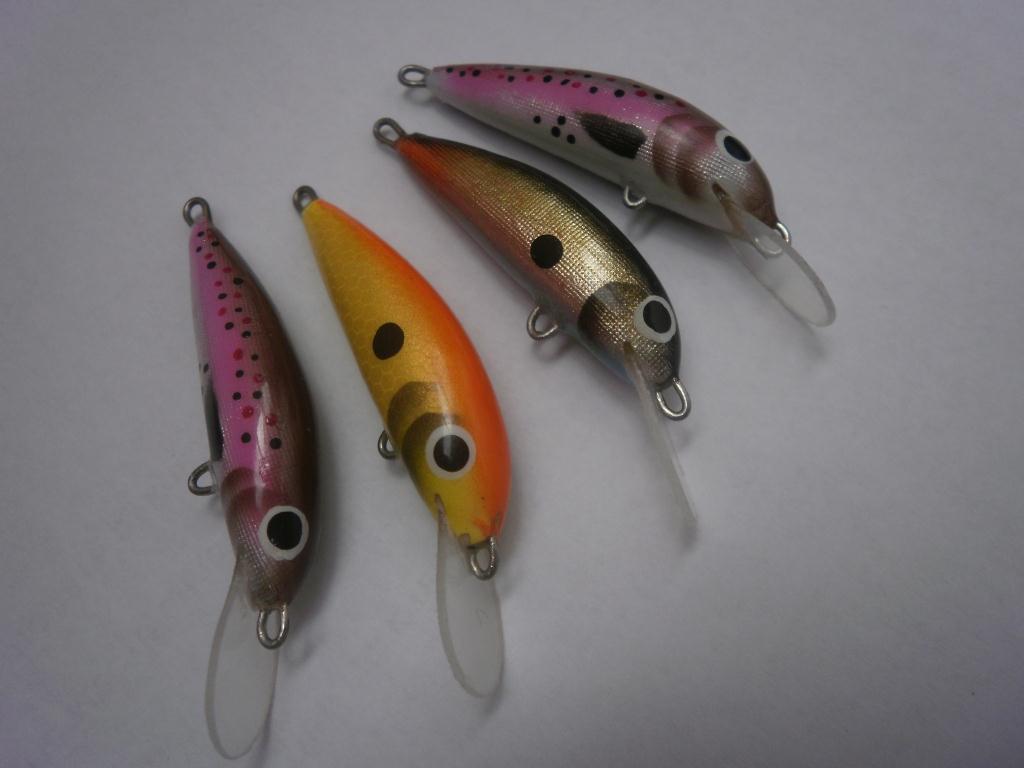 Я тоже чего-то там мучУ-экспериментирую в мини-формате: 2 карася 50 мм(береза - ошибся с бруском, не то схватил) и типа крэнк-45 мм(осина). Безлопастной карась задумывался как твичбейт (по типу Салмо Слайдер 5) и умышленно сделан под один крючок, огруженный, плавающий слегка. Карась с лопастью неогружен. Глаза покупные. Крэнк тоже огружен, плавающий, сделан под один крючок из-за кривизны рук - делать по нормальному пока не умею ( и большие непонятки с крючками: тройник ST-31 №8 большой, а №10 - уже маленький
