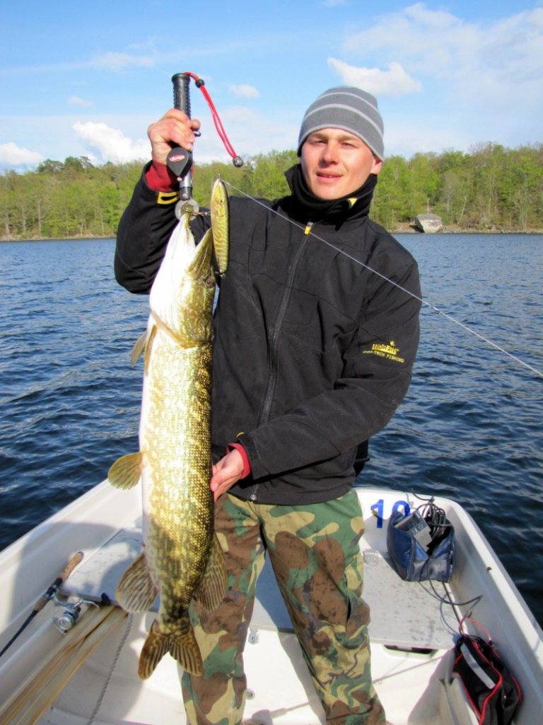 В следующие дни мы проверяли остальные перспективные места в радиусе 7-8 километров от базы и поняли что рыбка вот вот отнерестилась и в большинстве покинула мелководные заливы. Как назло градусник на третий день показывал утром около 3-5 градусов и днём около 10-11. Да ещё отстрелил своего удачного BBZ. Вместе с северным ветром упала и вода и унесло из заливов тёплую воду. Не найдя нигде достойных результатов на пятый день возвращаемся в счастливые заливы. И незря. Вода здесь до сих пор мутновата с температурой около 10 градусов. Проходим несколько раз уже знакомые места и уже пришалив к берегу из глубины на уже проверенного Sweeper’a ещё одна красавица. Недолгая борьба и щучка чуть меньше 8 кг и 105см позирует в наших руках.
