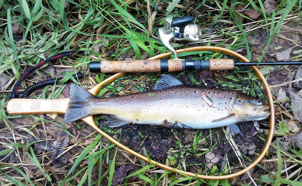 Вес составил 450 гр. 33 см длиной. Схватил адреналина , когда боролся с ним между двух поваленных берез. Поймал на свою самовязную нимфу а-ля "ред таг". Поймал еще 7 шт. от 22 до 25 см, но на жука из поролонки. Второй сезон уже не подводит жук.