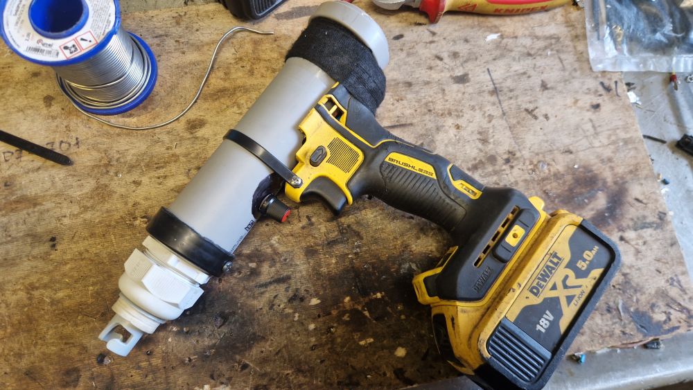 Насос для лодки в виде дрели с ручкой не удобен без шланга. По сему, он плавно перестроился в дуйку мусора с рабочего стола, розжик углей и сдувалку свежего снега с машины.